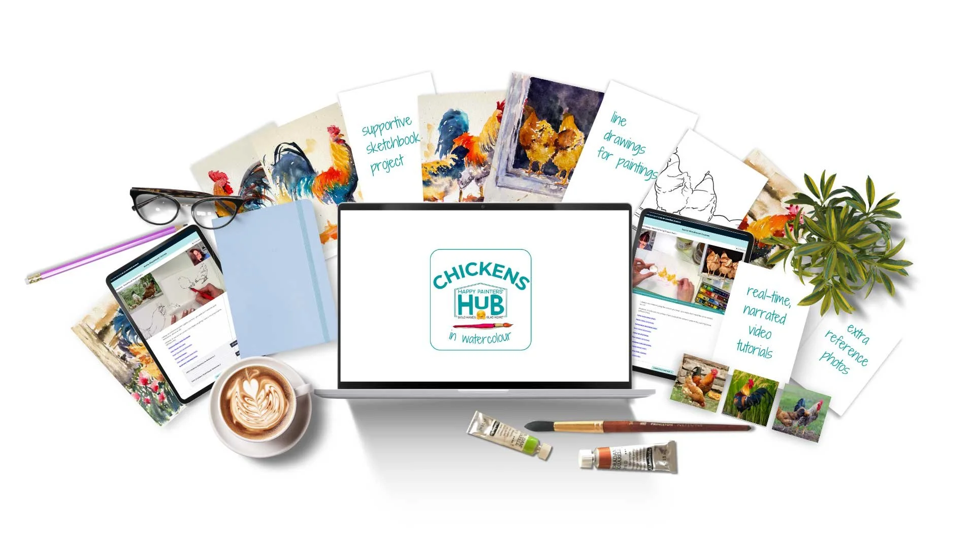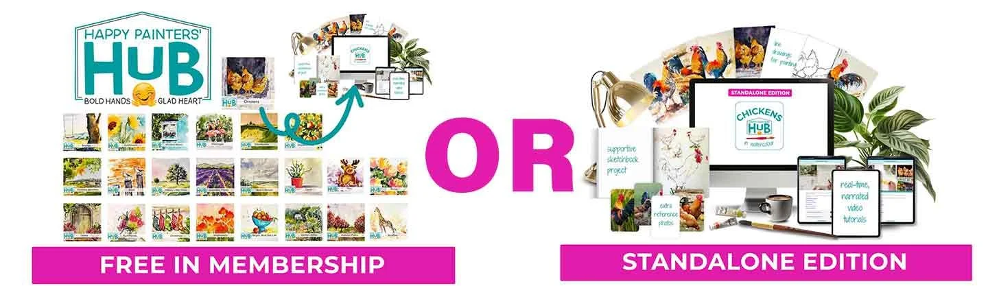 Ready to take your watercolour chicken painting further? Come and investigate Chickens In Watercolour. You can get the standalone course, or access this class plus a growing library of more than 20 other similar tutorials with a monthly membership.